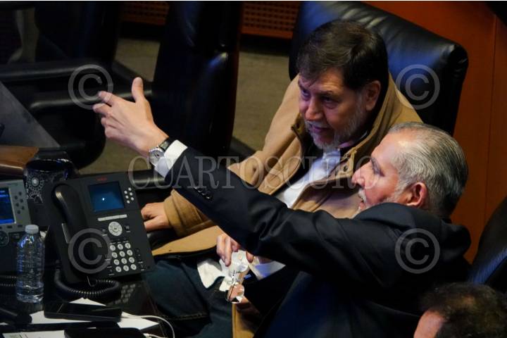 CIUDAD DE MÉXICO, 15OCTUBRE2025.- El senador Gerardo Fernández Noroña y el coordinador Adán Augusto López conversan durante la sesión del Senado de la República en que se discute el proyecto de decreto para reformar y adicionar disposiciones a la Ley de amparo. FOTO: GALO CAÑAS/CUARTOSCURO.COM