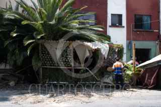 CIUDAD DE MÉXICO, 17OCTUBRE2025.- Esta mañana un árbol cayó sobre una terraza de madera a las afueras de un restaurante en la colonia Condesa. A pesar de que había comensales en el establecimiento, ninguno resultó lesionado. Elementos de Protección Civil acudieron para remover el árbol que causó daños en el local. El evento se registró en la calle Fernando Montes de Oca, casi esquina con Cuernavaca, alrededor de las 11:25 a.m. FOTO: CAMILA AYALA BENABIB /CUARTOSCURO.COM
