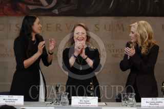 Ciudad de México, 17OCTUBRE2025.- La abogada Lorena Josefina Pérez; la ministra Yasmin Esquivel Mossa; Raquel Nieblas German quién asumió el cargo de presidenta de la Asociación Nacional de Juzgadoras en Democracia, A.C. (ANJUZ), y la maestra Jazmín Robles Cortés durante la presentación oficial de la ANJUZ en el marco del 72º Aniversario del Sufragio Femenino. Evento realizado en la zona de murales de la Suprema Corte de Justicia de la Nación (SCJN). FOTO: GALO CAÑAS/CUARTOSCURO.COM
