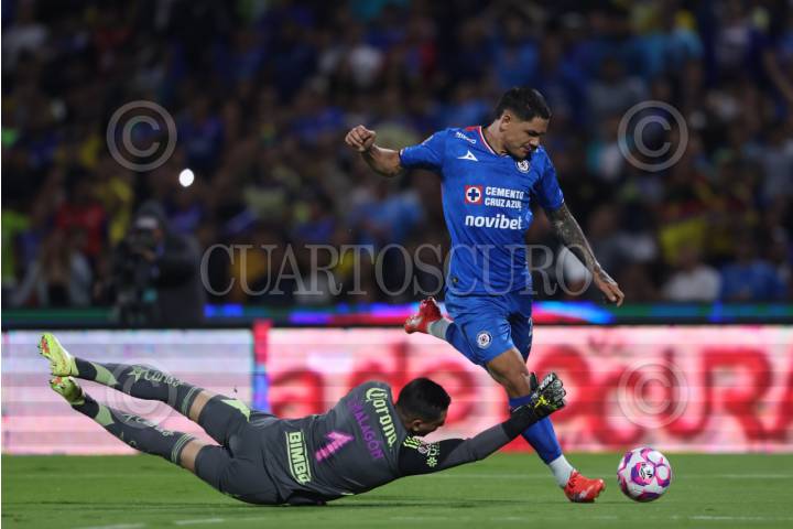 CIUDAD DE MÉXICO, 18OCTUBRE2025.- Gabriel Fernández de La Máquina vence a Luis Malagón portero de las Águilas durante el partido de fútbol Cruz Azul vs América correspondiente a la jornada 13 del Torneo Apertura 2025 de Liga BBVA MX, en el Estadio Olímpico Universitario.FOTO: EDGAR NEGRETE LIRA/CUARTOSCURO.COM