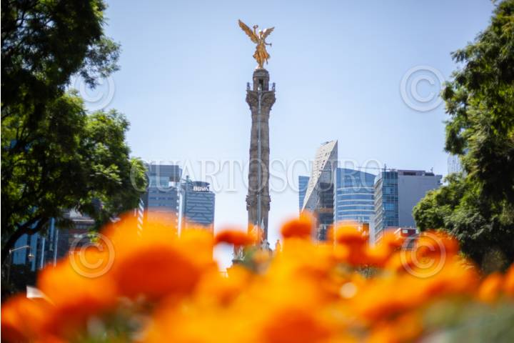 CIUDAD DE MÉXICO, 19OCTUBRE2025.- Entre el mercado de cempasúchil y flores adornando Paseo de la Reforma se asoma el Ángel de la Independencia. FOTO: ANDREA MURCIA /CUARTOSCURO.COM