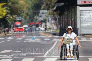 CIUDAD DE MÉXICO, 21OCTUBRE2025.- Una mujer en silla de ruedas que se transportaba en el Metrobús tuvo que terminar su recorrido rodando sobre el asfalto de avenida Insurgentes debido a que el servicio de la Línea se suspendió debido a un bloqueo en avenida reforma e Insurgentes. FOTO: MOISÉS PABLO/CUARTOSCURO.COM