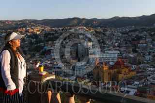 GUANAJUATO, GUANAJUATO, 26OCTUBRE2025.- Una mujer recibe los primeros rayos del sol durante el amanecer desde el Mirador del Pipila. FOTO: GRACIELA LÓPEZ/CUARTOSCURO.COM