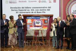 CIUDAD DE MÉXICO, 27OCTUBRE2025.- Olivia Salomón, directora de la Lotería Nacional, le entrega el boleto conmemorativo por el 15 aniversario del Buen Fin, al subsecretario de Economía, Vidal Llerenas. FOTO: DANIEL AUGUSTO/ CUARTOSCURO.COM