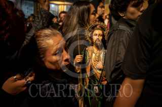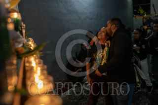 TIJUANA, BAJA CALIFORNIA, 28OCTUBRE2025.– Cientos de fieles celebraron este 28 de octubre a San Judas Tadeo, patrono de las causas imposibles, en la colonia Pedregal de Santa Julia en Tijuana. La festividad inició la noche del lunes con mañanitas, música de banda y un altar adornado con flores, veladoras y el característico color verde. Los devotos acudieron con imágenes del santo para agradecer y pedir milagros. Entre los testimonios, una mujer llevó la foto de su hijo fallecido, quien era devoto del santo. Las calles aledañas se llenaron de puestos, música y creyentes vestidos con túnicas verdes, en un ambiente de fe y convivencia popular.. FOTO: OMAR MARTÍNEZ / CUARTOSCURO.COM