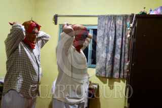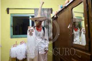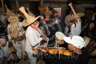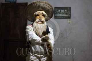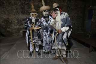 SANTA MARÍA CHILCHOTLA, OAXACA, 28OCTUBRE2025.- Con el primer recorrido de “Huehuentones” (hombres del ombligo), habitantes de Santa María Chilchotla, comunidad mazateca ubicada a 244 kilómetros de la capital de Oaxaca, dan inicio a la celebración de Día de Muertos. Hombres, mujeres y niños ataviados con ropa de manta, máscara y sombreros, acompañados de música de violín, tambor y vihuela inician el recorrido en el panteón de la comunidad a donde acuden a pedir permiso y recogen a las ánimas, posteriormente bailan en la iglesia, último lugar en donde despidieron a sus difuntos, después se dirigen al palacio municipal en donde fueron registrados al nacer, y de ahí parten a visitar casas en donde bailan y conviven con familiares, estos recorridos los realizan todas las noches durante 10 días a partir del 27 de octubre. En la cosmovisión mazateca, las personas que se visten de “Huehuentones” prestan sus cuerpos para que las ánimas de personas ya fallecidas puedan visitar a sus seres queridos y convivir con ellos durante las festividades de fieles difuntos, para Santa María Chilchotla esta es su celebración principal. FOTO: CAROLINA JIMÉNEZ/CUARTOSCURO.COM