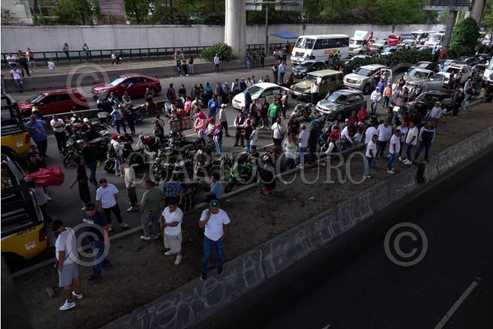 NAUCALPAN, ESTADO DE MÉXICO, 29OCTUBRE2025.- Integrantes de la Alianza de Autotransportistas, Comerciantes y Anexos del Estado de México, realizaron un bloqueo sobre Periférico a la altura de Parque Naucalli, con el objetivo de arribar a la Palaza de la Constitución, esto en forma de protesta para exigir el alto al hostigamiento y la fabricación de delitos en su contra. FOTO: ROGELIO MORALES /CUARTOSCURO.COM