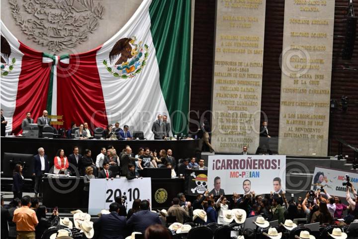 CIUDAD DE MÉXICO, 04NOVIEMBRE2025.- Diputados del Grupo parlamentario PRI colocaron sombreros con sangre en protesta al asesinato de Carlos Manzo durante discusión del proyecto del presupuesto de egresos de la federación para el ejercicio fiscal 2025. FOTO: ANDREA MURCIA /CUARTOSCURO.COM