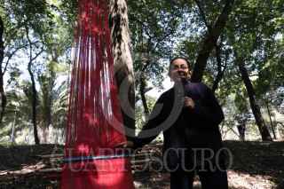 CIUDAD DE MÉXICO, 06NOVIEMBRE2025.- La artista María Sosa presentó la intervención escultórica “Las Ancestras que Tejen, Hablan y Caminan”, en los Jardines del Museo de Arte Moderno, en las cuales reflexiona sobre la técnica ancestral del telar circular mediante una instalación de urdimbres de hilo rojo. La autora señala que, aunque su obra se perciba en un plano bidimensional para ella lo importante es la energía que se le transmite durante la hechura y poder transmitir todo el esfuerzo que significa hacer telas con esta técnica de los pueblos mesoamericanos. FOTO: MOISÉS PABLO/CUARTOSCURO.COM