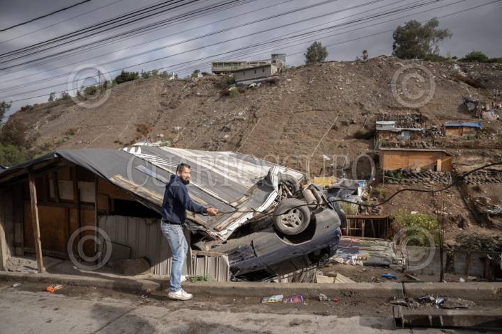 TIJUANA BAJA CALIFORNIA 21NOVIEMBRE2025.- Una camioneta Toyota RAV4 volcó en la avenida Matamoros, de la colonia Rinconada, y terminó dentro de una vivienda. El conductor, de 24 años, salió ileso y señaló que perdió el control tras caer en un bache profundo. La dueña de la casa afectada señaló que escuchó el fuerte impacto y luego encontró el vehículo volcado dentro de uno de los cuartos de la vivienda. FOTOS OMAR MARTÍNEZ/ CUARTOSCURO.COM