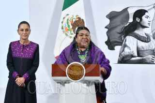 CIUDAD DE MÉXICO, 21NOVIEMBRE2025.- Claudia Olivia Morales Reza, titular de CONAPRED, durante su intervención en la conferencia matutina en la que se mencionaron las acciones y planes del gobierno federal para la erradicación en todos los niveles de violencia hacia las mujeres. La acompaña Claudia Sheinbaum, presidenta de México. Cada 25 de noviembre se conmemora el "Día internacional de la eliminación de la violencia contra la mujer. FOTO: MARIO JASSO/CUARTOSCURO.COM