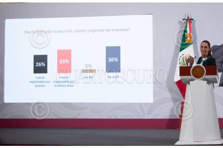 CIUDAD DE MÉXICO, 26NOVIEMBRE2025.- Claudia Sheinbaum Pardo, presidenta de México, durante conferencia en Palacio Nacional. En la imagen encuesta sobre la pasada protesta de la generación Z. FOTO: ANDREA MURCIA /CUARTOSCURO.COM
