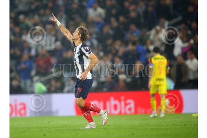 GUADALUPE, NUEVO LEÓN, 26NOVIEMBRE2025.- Sergio Canales de los Rayados del Monterrey, festeja el gol ante el América, en el Estadio BBVA, partido correspondiente a la ida de Cuartos de Final de la Apertura 2025. Marcador Final: Monterrey: 2 - América: 0 FOTO: GABRIELA PÉREZ MONTIEL / CUARTOSCURO.COM
