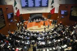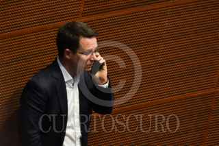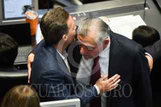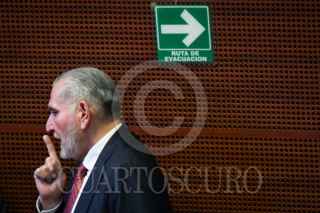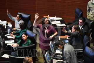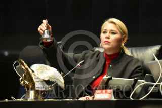 CIUDAD DE MÉXICO, 02DICIEMBRE2025.- Jasmine María Bugarín, senadora del PVEM, muestra su atuendo a Gerardo Fernández Noroña, senador del PT, durante la sesión ordinaria de la Cámara de Senadores en la que se discute el acuerdo del listado de 10 personas candidatas y candidatos para ocupar el cargo de titular de la Fiscalía General de la República. FOTO: MARIO JASSO/CUARTOSCURO.COM