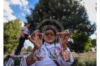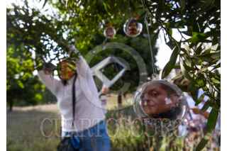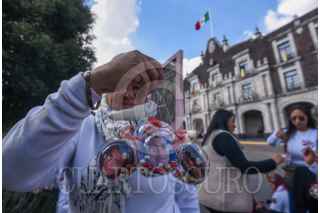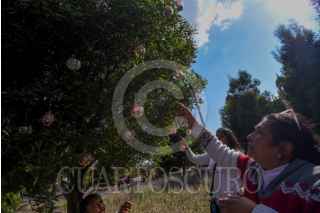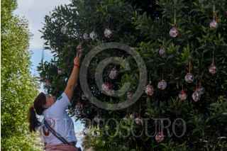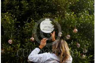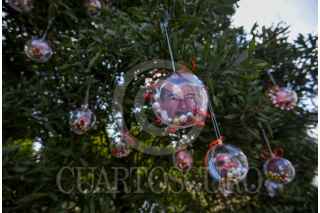 TOLUCA, ESTADO DE MÉXICO, 04DICIEMBRE2025.- Integrantes de los colectivos Mariposas Buscando Corazones y Justicia Nacional y Hasta Encontrarles CDMX colocaron esferas con fotografías en memoria de sus familiares desaparecidos en árboles ubicados al frente de Palacio de Gobierno, esta actividad la replicarán en otras ciudades incluida CDMX recordando aquellos que se encuentran ausentes, mientras sus familias continúan su búsqueda. FOTO: CRISANTA ESPINOSA AGUILAR/CUARTOSCURO.COM