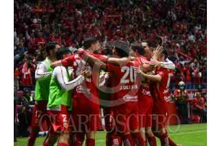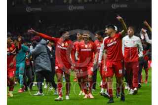 TOLUCA, ESTADO DE MÉXICO, 06DICIEMBRE2025.- Santiago Simón, Jesús Angulo y Franco Romero, medios de los Diablos de Toluca festejan su victoria ante la escuadra de los Rayados de Monterrey, en el partido de vuelta de semifinales, terminando el encuentro 3-2, global 3-3, consiguiendo su pase a la gran final del fútbol mexicano del Torneo Apertura 2025 de la Liga MX la escuadra escarlata. FOTO: CRISANTA ESPINOSA AGUILAR/CUARTOSCURO.COM