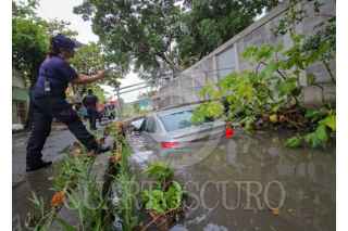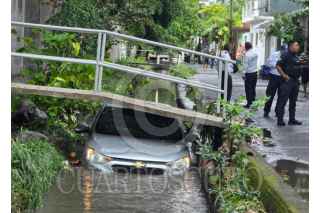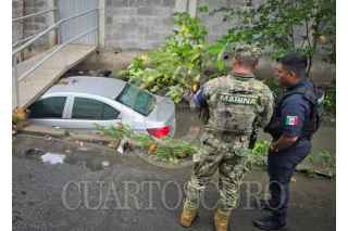 BOCA DEL RIO, VERACRUZ, 08DICIEMBRE2025.- Dos personas a bordo de un vehículo marca Chevrolet, cayeron a un canal de aguas negras en la colonia El Manantial de la Ciudad de Boca del Río, esto porque el conductor perdió el control sobre la calle Úrsulo Galván debido a la fuerte lluvia, al lugar del incidente acudieron elementos de La Marina y Policía Estatal para auxiliar a los pasajeros y posteriormente fue retirado con una grúa. FOTO: VICTORIA RAZO/CUARTOSCURO.COM