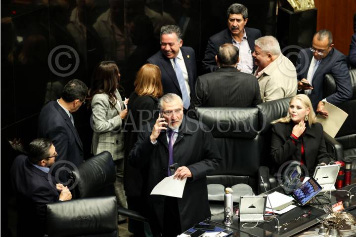 CIUDAD DE MÉXICO, 09DICIEMBRE2025.- El coordinador morenista Adán Augusto López subió a la tribuna para conversar con la presidenta de la mesa directiva, Laura Itzel Castillo, durante la penúltima sesión del 2025 en el Senado de la República. FOTO: GALO CAÑAS/CUARTOSCURO.COM