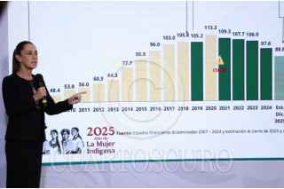 CIUDAD DE MÉXICO, 11DICIEMBRE2025.- Claudia Sheinbaum Pardo, presidenta de México, mostró una gráfica con la evolución de la deuda en Petróleos Mexicanos (PEMEX) durante la conferencia Mañanera del Pueblo. FOTO: GALO CAÑAS/CUARTOSCURO.COM