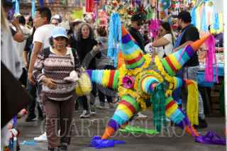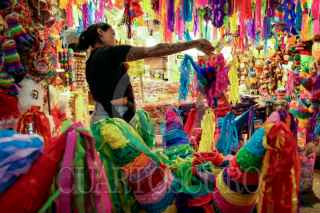 CIUDAD DE MÉXICO, 12DICIEMBRE2025.- El comerciante Ángel Padilla viste sus piñatas hechas a mano para comerciar en las inmediaciones del Mercado de Jamaica de cara a la celebración de las fiestas decembrinas. Cuenta haber aprendido el oficio de sus abuelos, pero teme que ahora no haya quién continúe el legado en su familia. FOTO: GALO CAÑAS/CUARTOSCURO.COM
