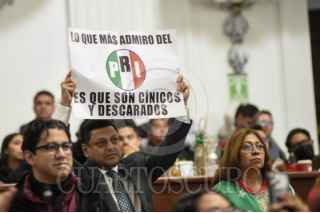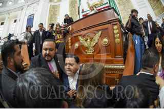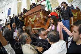 CIUDAD DE MÉXICO, 15DICIEMBRE2025.- Diputados de Morena protagonizaron un zafarrancho en la tribuna del Congreso de la Ciudad de México cuando intentaron bajar a los diputados del PAN que la habían tomado, al calor de la discusión de la desaparición de INFO CDMX, tras los jalones de pelo, los legisladores morenistas trasladaron la sesión a su sede alterna del Zócalo. FOTO: ARTURO JIMÉNEZ/CUARTOSCURO.COM