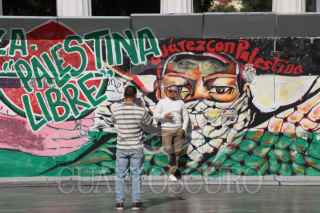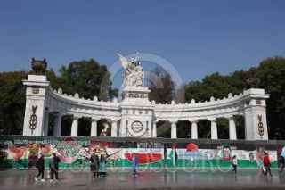 CIUDAD DE MÉXICO, 21DICIEMBRE2025.- El Hemiciclo a Juárez permanece tapiado esto debido a las protestas de colectivos que apoyan a la nación palestina, misma que en este momento vive un genocidio por parte de Israel, el cual ha sido condenado por la ONU y varias naciones. Turistas nacionales e internacionales aprovechan los murales pintados en las vallas que rodean el inmueble para tomarse la foto. FOTO: MOISÉS PABLO/CUARTOSCURO.COM