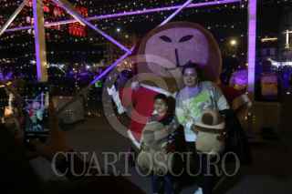 CIUDAD DE MÉXICO, 21DICIEMBRE2025.- Una familia se tomó fotografías con los personajes de Capibara navideño en la Verbena Navideña en el Zócalo capitalino. FOTO: GRACIELA LÓPEZ /CUARTOSCURO.COM