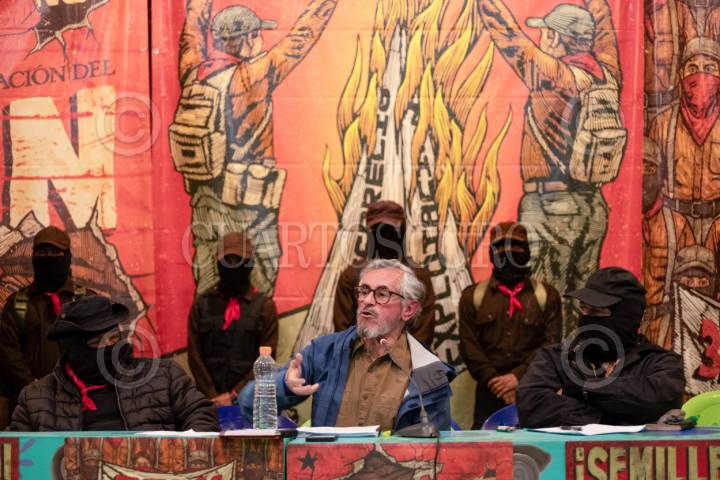 SAN CRISTÓBAL DE LAS CASAS, CHIAPAS, 30DICIEMBRE2025.- Se llevó a cabo la cuarta sesión del encuentro "Semillero de Pirámides, de historias, de amores y, claro, desamores", con la participación de Arturo Anguiano, Carlos Tornel, subcomandante Marcos y el subcomandante Moisés, en el CIDECI Universidad de la Tierra. FOTO: ISABEL MATEOS HINOJOSA/CUARTOSCURO.COM