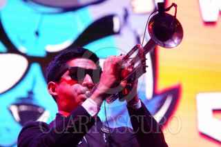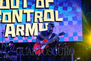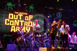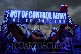 CIUDAD DE MÉXICO, 30DICIEMBRE2025.- Durante el Festival de Luces de Invierno, fanáticos acudieron a la presentación de la banda Out of Control Army en el Zócalo Capitalino, algunos portando banderas con el logo del grupo musical. FOTO: CAMILA AYALA BENABIB / CUARTOSCURO.COM