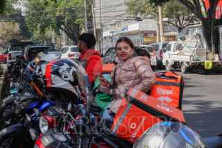 CIUDAD DE MÉXICO, 31DICIEMBRE2025.- A partir de 2026, los choferes repartidores de aplicaciones en moto podrán solicitar su afiliación al IMSS. En la imagen, repartidores de aplicaciones se reúnen a la espera de pedidos afuera de una sucursal de Casa de Toño, ubicada en Calzada Obrero Mundial, esquina con Cuauhtémoc. FOTO: CAMILA AYALA BENABIB / CUARTOSCURO.COM