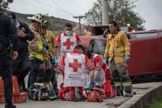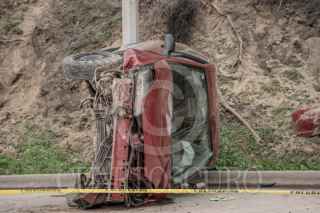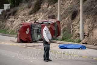 TIJUANA BAJA CALIFORNIA 02ENERO2026.-Un conductor murió tras volcarse el vehículo que conducía sobre el Libramiento Sur, en dirección al Soler. Paramédicos de la Cruz Roja y elementos del Cuerpo de Bomberos llegaron al lugar y le realizaron maniobras de reanimación; sin embargo, el hombre, de entre 35 y 40 años de edad, fue declarado sin vida en el lugar. El vehículo, un Ford Focus rojo con placas de Baja California, terminó volcado sobre la vialidad, quedando la escena a cargo de Servicios Periciales de la Fiscalía General del Estado. FOTOS CHRIS NOYOLA/CUARTOSCURO.COM