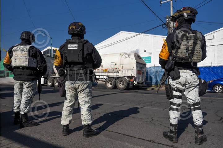 TOLUCA, ESTADO DE MÉXICO, 07ENERO2026.- Elementos de la Guardia Nacional resguardan una pipa que transportaba nitrógeno con sobrecarga, y de la cual se tuvo que hacer una liberación gradual y controlada del gas en exceso, esto en la calle José Martí, en la colonia Independencia en la ciudad de Toluca. Cuerpos de emergencia acudieron al lugar para descartar cualquier peligro para la población. FOTO: CRISANTA ESPINOSA AGUILAR/CUARTOSCURO.COM