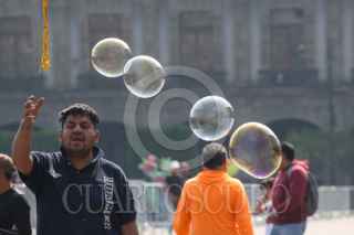 CIUDAD DE MÉXICO, 18ENERO2026.- Vendedor de artefactos para hacer burbujas muestran la eficacia de su producto en el Zócalo, las autoridades capitalinas han señalado que ya no se tolerará el comercio informal en el primer cuadro. FOTO: MOISÉS PABLO/CUARTOSCURO.COM