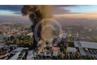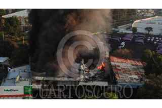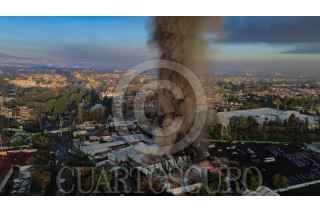 CIUDAD DE MÉXICO, 22ENERO2026.- Aspectos panorámicos del incendio registrado en una supuesta fábrica de plásticos, ubicada sobre Avenida Guadalupe a la altura de la estación del Tren Ligero la Noria en la alcaldía Xochimilco. Al lugar arribaron equipos de emergencia capitalina para realizar labores de contención, controlar el incendio y posteriormente sofocarlo. FOTO: ROGELIO MORALES /CUARTOSCURO.COM