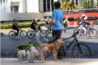 CIUDAD DE MÉXICO, 25ENERO2026.- Un hombre hace una pausa con sus perros, también llamados animales de compañía o mascotas, durante el Paseo de la Reforma. FOTO: MOISÉS PABLO/CUARTOSCURO.COM