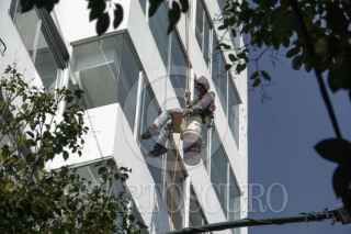 CIUDAD DE MÉXICO, 29ENERO2026.- Un trabajador colgado de un edificio, realiza labores de pintura en la fachada del inmueble. FOTO: CAMILA AYALA BENABIB / CUARTOSCURO.COM