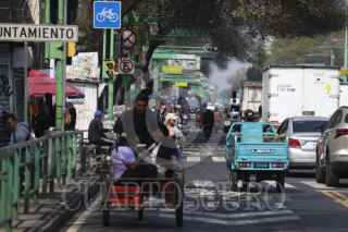 CIUDAD DE MÉXICO, 05FEBRERO2026.- Operadores del transporte público que circulan diariamente por Eje Central, mantiene la invasión de motonetas y moticletas estacionadas, impiendo el flujo de la circulación de bicicletas en la ciclovía compartida en esta zona. FOTO: GRACIELA LÓPEZ /CUARTOSCURO.COM