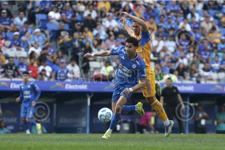 PUEBLA, PUEBLA, 15FEBRERO2026.- Ángel Márquez y Cesar Araújo durante el partido entre entre la Máquina Celeste del Cruz Azul y los Tigres de la UANL, correspondiente a la jornada 6 del torneo Clausura 2026 de la Liga BBVA MX, celebrado en el estadio Cuauhtémoc. FOTO: MIREYA NOVO/ CUARTOSCURO.COM