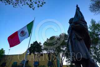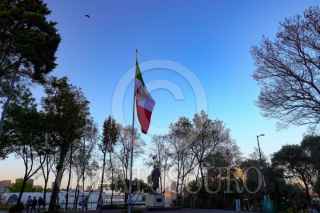 CIUDAD DE MÉXICO, 24FEBRERO2026.- Una estatua de Miguel Hidalgo, custodia la bandera de México que ondea frente al monumento del luchador independentista. FOTO: ROGELIO MORALES /CUARTOSCURO.COM