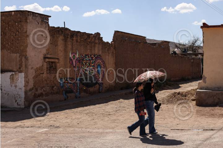 OJOCALIENTE, ZACATECAS, 02MARZO2026.- Murales en la comunidad de Palmillas, comunidad que cumplió dos años cómo “Pueblo Típico”, otorgado por la Secretaría de Turismo (Sectur), al cumplir su segundo aniversario fueron pintados nuevos murales a cargo del colectivo Los Parches de Río Grande y el pintor zacatecano Rolando González López. La comunidad también forma parte de la ruta histórica Camino Real Tierra Adentro, como punto de paso en dónde se construyó el primero camino durante la Colonia desde la Ciudad de México hasta lo que ahora es Nuevo México, en los Estados Unidos. FOTO: ADOLFO VLADIMIR /CUARTOSCURO.COM