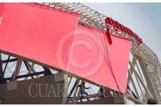 Estadio Azteca CIUDAD DE MÉXICO, 05MARZO2026.- Luego de diversas críticas y burlas por los paneles color rojo colocados en el nuevo techo del Estadio Banorte antes Azteca, continúan los trabajos de colocación del material EFTE (Etileno Tetra Fluoro Etileno), un polímero que cuenta con diversas propiedades destacando si alta durabilidad. FOTO: ROGELIO MORALES /CUARTOSCURO.COM