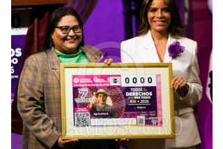 CIUDAD DE MÉXICO. 05MARZO2026.- Olivia Salomón, Citlali Hernández, Emilia Calleja y Pascasia Cecilia Jaime, encabezaron la presentación del billete conmemorativo del Sorteo Zodiaco No. 1737 con motivo del Día Internacional de las Mujeres. FOTO: VICTORIA VALTIERRA/CUARTOSCURO.COM