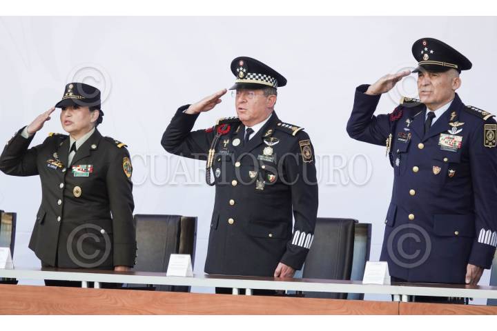 CIUDAD DE MÉXICO, 06MARZO2026.- Patricia Verónica del Castillo López, directora de la Escuela Militar de Odontología; Hernán Cortés Hernández, oficial mayor de la Secretaría de la Defensa Nacional; y Miguel Eduardo Hernández Velázquez, inspector y contralor general del Ejército, Fuerza Aérea y Guardia Nacional, durante la ceremonia del “50 aniversario de la creación de la Escuela Militar de Odontología. FOTO: CAMILA AYALA BENABIB / CUARTOSCURO.COM