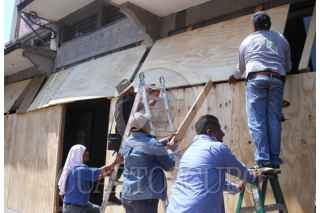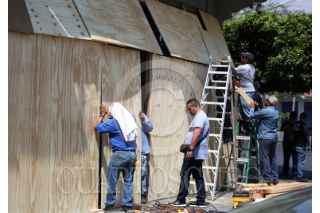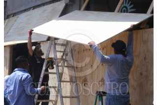 CUERNAVACA, MORELOS, 06MARZO2026.-Trabajadores del gobierno de Morelos tapan la fachada del edificio Victoria con tablones de madera previo a el 8 de marzo, Día Internacional de la Mujer. En la parte baja se encuentra la tienda Tlalli Artesanías y Productos Morelenses que administra la Secretaria de Cultura y abierta al publico el pasado 28 de enero. FOTO: MARGARITO PÉREZ RETANA/CUARTOSCURO.COM