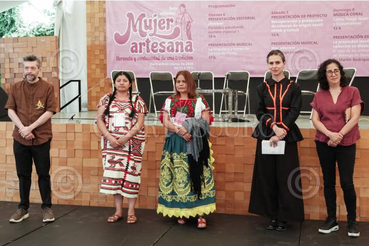 CIUDAD DE MÉXICO, 06MARZO2026.- Participaron en la inauguración de la Feria artesanal “Mujer artesana, herencia y continuidad de una tradición”, en el Museo Nacional de Culturas Populares, el director del recinto, Emilio Montemayor Anaya; las artesanas María Isabel Olivera Hernández, de Teococatzintla, Oaxaca, y Alicia Ascencio Juan, de Puácuaro, Michoacán; la directora general de Culturas Populares, Adriana Hernández Ocampo; y la periodista y escritora Tatiana Maillard. FOTO: CAMILA AYALA BENABIB / CUARTOSCURO.COM