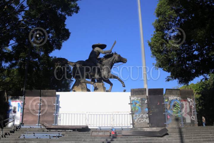 CUERNAVACA, MORELOS, 07MARZO2026.- Previo al Día Internacional de la Mujer el Palacio de Gobierno de Morelos fue resguardado con vallas metálicas de más de dos metros, también fue protegido el monumento al General Emiliano Zapata ubicado en la plaza de armas. Mañana dos marchas de protesta se realizarán, la primera saldrá del campus universitario a las 8:30 de integrada por estudiantes universitarias que exigen en la universidad, un diálogo con las autoridades y la renuncia de la rectora Viridiana Aydeé León Hernandez luego del asesinato de dos estudiantes de la máxima casa de estudios de Morelos; la otra movilización iniciará en la glorieta de Tlaltenango a las 10 de la mañana compuesta de colectivos de búsqueda de desaparecidos y en contra de los feminicidios. FOTO: MARGARITO PÉREZ RETANA/CUARTOSCURO.COM