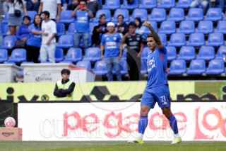 PUEBLA, PUEBLA, 7MARZO2026.-Miguel García y José Padela durante el partido entre la Máquina Celeste del Cruz Azul y el Atlético San Luis, correspondiente a la jornada 10 del torneo Clausura 2026 de la Liga BBVA MX, celebrado en el estadio Cuauhtémoc. FOTO: MIREYA NOVO/ CUARTOSCURO.COM