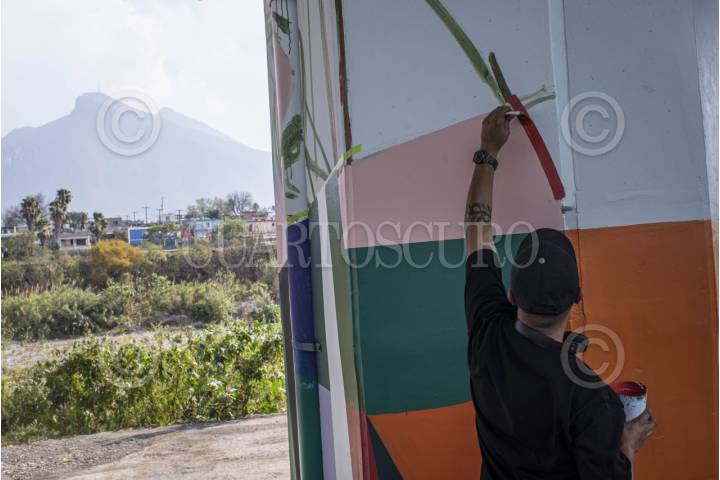 GUADALUPE, NUEVO LEÓN, 08MARZO2026.- Como parte del proyecto Trazos Mundialistas, iniciativa del Gobierno del Estado, el artista urbano y diseñador gráfico neolonés, Adrian Rodríguez "Asero", diseña y lleva a cabo la realización de un mural que se extiende a lo largo de más de quince columnas del viaducto de Guadalupe, a un lado del Río Santa Catarina. El mural, que es parte del programa "Ponte Nuevo. Ponte Mundial", en una especie de cronología, narra el nacimiento y crecimiento de un futbolista, desde su temprana infancia, hasta su cristalización profesional. Ademas, el trabajo pictórico hace alusión de manera figurativa a una serie de jugadores nacionales e internacionales y sucesos de la cultura futbolística. FOTO: PEDRO ANZA /CUARTOSCURO.COM