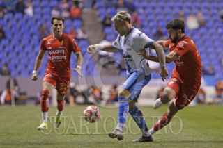 PUEBLA, PUEBLA, 13MARZO2026.- Iker Moreno y Kevin Gutiérrez durante el partido entre el Club Puebla y los Rayos del Necaxa, correspondiente a la jornada 11 del torneo Clausura 2026 de la Liga BBVA MX, celebrado en el estadio Cuauhtémoc. FOTO: MIREYA NOVO/ CUARTOSCURO.COM