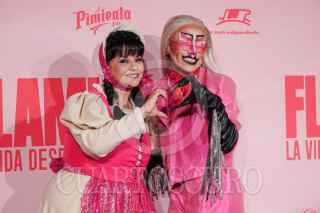 CIUDAD DE MÉXICO, 18MARZO2026.- Alma Gómez Fuentes, conocida como “Cositas”, conductora y creadora de contenido; y la artista drag La Morra Lisa, a su paso por la alfombra rosa del documental “Flamingos: La vida después del meteorito”. FOTO: CAMILA AYALA BENABIB / CUARTOSCURO.COM